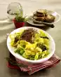 Season to taste with salt, pepper and thyme. Drain the noodles and put them with the shredded meat and the sauce in a greased casserole dish. Spread herb crust over it. Bake in the preheated oven (electric cooker: 200 °C/ convection oven: 175 °C/ gas: level 3) for 10-15 minutes.