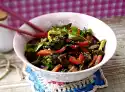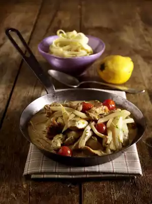 Add stock, cream and quince with liquid, bring to the boil. Stir in sauce thickener and bring sauce to the boil once. Season to taste with salt, pepper and a little nutmeg. Sprinkle with remaining thyme and serve with the noodles.