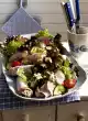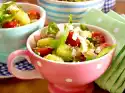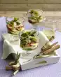 Season the cucumber salad to taste again. Fold in remaining coriander leaves. Fill cucumber salad into glasses. Put minced meat and prawn skewers into the salad.
