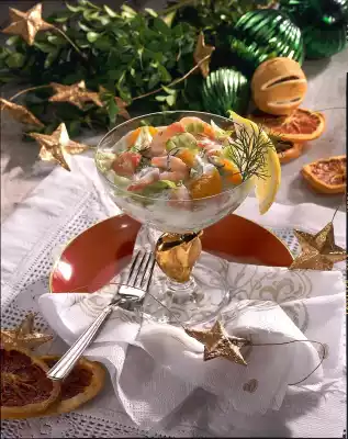 Season to taste with salt, pepper and lemon juice. Rinse dill cold, dab dry and chop. Stir into the sauce. Mix the shrimps, mandarin oranges and salad with the dressing and divide between four cocktail glasses.