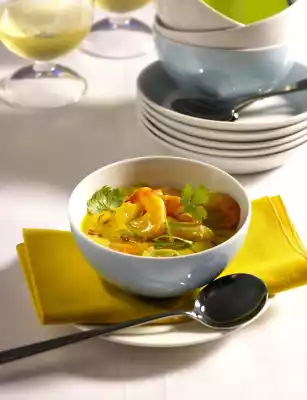 Season curry with salt, pepper, coriander and lemon juice. Remove the lemongrass. Heat prawns and 3/4 of the spring onions in the curry. Season curry to taste again. Serve everything. Garnish with the rest of the spring onions and coriander green.