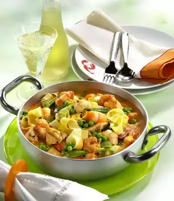 Add spring onions and fry briefly. Deglaze with broth, add peas, bring to the boil. Stir in soup paste, simmer for 3 minutes. Melt 1 tablespoon of fat. Drain noodles and toss in fat. Season shrimp pan with salt and pepper, refine with cream. Fold in the noodles and serve