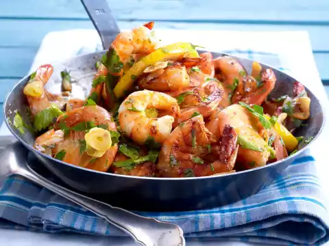 Wash the shrimps and pat them dry. Peel and slice the garlic. Wash lemon hot, grate dry and cut into slices. Heat oil in a pan. Fry prawns while turning for 6-10 minutes.