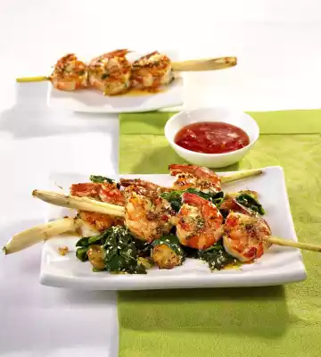 Roast sesame seeds without fat. Fry skewers in 2 tablespoons of hot oil for 4-5 minutes, salt. Serve with spinach, sprinkle with sesame seeds. Serve the rest of the chilli sauce extra. Rice tastes good with it