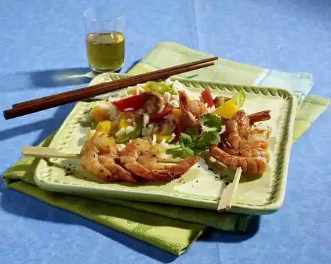 Add oil to the hot pan. Fry the prawn skewers for about 2 minutes on each side. Remove and keep warm. Fry peppers in hot fat for about 2 minutes. Add ginger and spring onions and fry briefly.