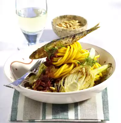 Add the pine nuts and raisins and fry briefly. Deglaze with vegetable stock and bring to the boil once. Season with salt and pepper. Drain the pasta. Arrange everything on plates, garnish with whole sardines and chopped fennel greens.