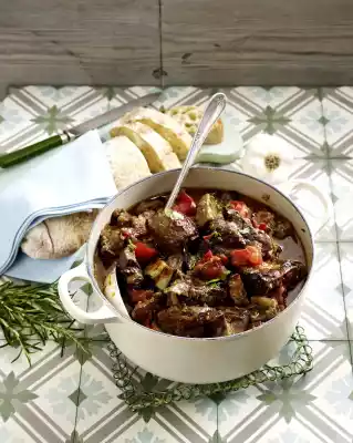 Add onions, garlic, eggplant and rosemary at the end and fry for another 5 minutes. Add the whole goulash again. Season with salt and pepper.