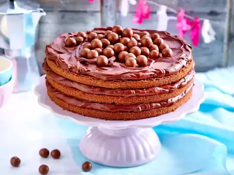 Place the sponge cake bases next to each other. Whip the chocolate cream with the whisk of the hand mixer until creamy. Spread each cake base with 1/3 chocolate cream and layer. Finally spread Maltesers on the cake.