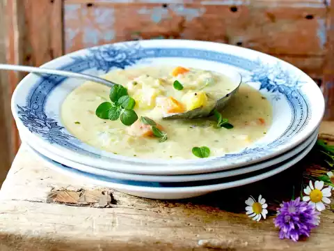 Heat clarified butter in a pot, fry onions and garlic in it. Add soup vegetables and potatoes and fry while turning. Season with salt, pepper and caraway seeds, add vegetable stock. Bring to the boil, cover and cook for 20-25 minutes