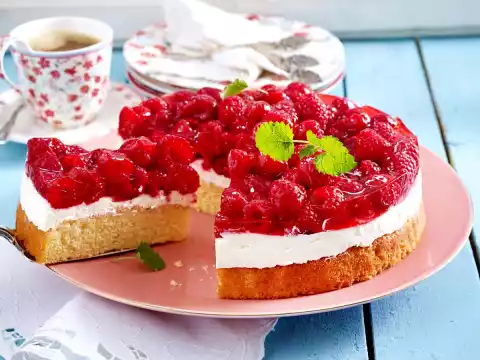 Raspberries selected. Stir the quark, mascarpone, lemon juice and 4 tablespoons of sugar until smooth. Remove the cake from the tin. Place a cake ring around the cake. Spread the cream evenly on the cake. Spread raspberries on the cream.