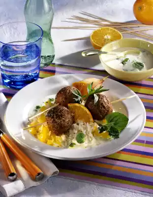 Peel and halve the shallots. Knead minced meat, mustard and curd. Season with salt and pepper and form into balls. Put balls, orange and shallots on skewers. Fry in hot oil over medium heat for 7-10 minutes while turning.