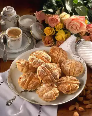 Warm the jam. Spread the dough bases with it. Add 1 tablespoon of almond paste to each base. Place 2 strips of dough on each. Whisk 1 egg yolk and spread on the cake. Bake on the grid in the hot oven (electric range: 200 °C/circulating air: 175 °C/gas: level 3) on the middle shelf for about 40 minutes. Let them cool down. Dust with 2 tablespoons of icing sugar