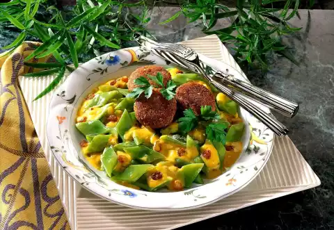 Heat the oil in a frying pan and fry the roasts for 3-4 minutes on each side. Arrange the bean vegetables on plates and serve garnished with parsley.