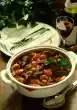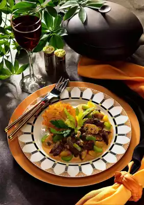 Add the meat to the vegetables, season with salt and pepper. Add sauce thickener while stirring, bring to the boil again. Arrange the shredded meat and potato cookies on plates and garnish with celery green.