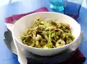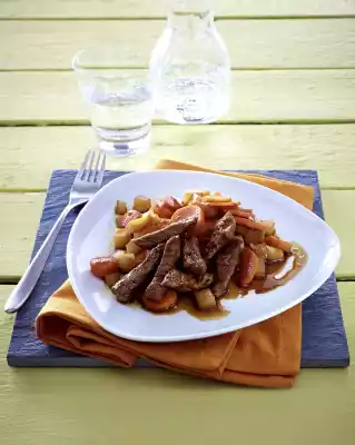 Heat the oil in a frying pan. Fry the meat for 3-4 minutes while turning, season with 1 pinch of salt and pepper and remove. Add vegetables to the hot frying fat, fry for 2-3 minutes while turning, deglaze with white wine stock, bring to the boil, add meat, bring to the boil again, season to taste with pepper, sugar, salt if necessary. Leave to stand for approx. 5 minutes on the switched off hotplate and serve