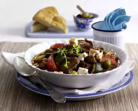 Fold in the sheep's cheese cubes. Serve the shredded meat and garnish with the remaining oregano. Flatbread tastes good with it.
