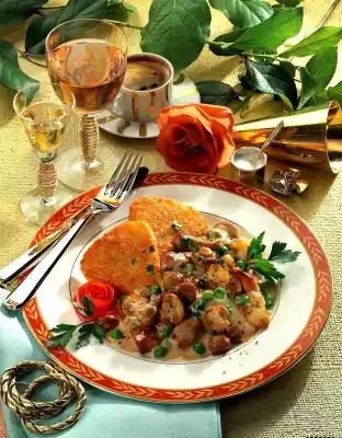 Add meat and frozen peas to the mushrooms and deglaze with broth and cream. Season with salt and pepper and stew covered for about 5 minutes. Stir the processed cheese in small pieces into the hot sauce.