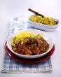 Fry the meat in a coated pan in hot oil until it is firm. Season, remove. Sauté garlic and vegetables in the frying fat. Sprinkle with approx. 1 teaspoon curry and sauté briefly. Stir in 100 ml water and stock. Bring to the boil, cover and simmer for about 5 minutes. Stir in crème balance and lime juice. Season to taste. Arrange and garnish