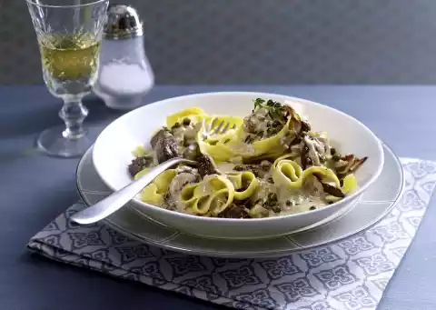 Heat steak strips in it. Season to taste with salt and possibly some pepper stock. Drain the pasta very well and serve with the pepper cream sauce.