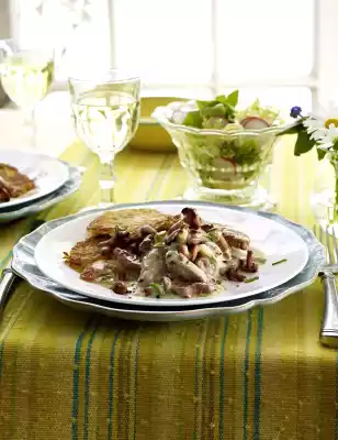 Heat the fillet in the sauce. Season to taste and serve with the Rösti. Sprinkle with spring onion green. Serve with green salad.