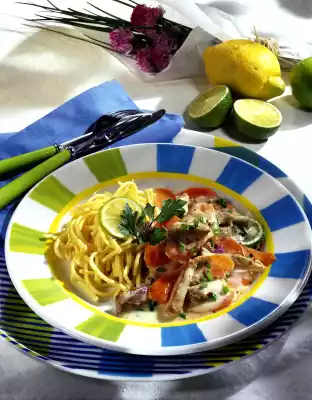 Stir in the milk, bring to the boil briefly and thicken the sauce slightly. Season to taste with lime juice, salt and pepper. Serve everything. Garnish with lime and herbs if necessary