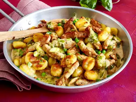Add frozen peas and spring onions, bring to the boil and simmer for 2-3 minutes. Stir grated lemon peel and pesto into the sauce and season with salt and pepper. Fold in gnocchi.