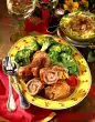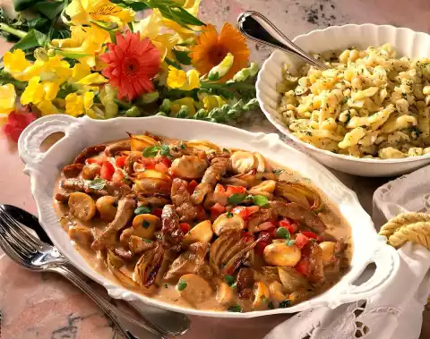 Remove meat from the pan. Fry the mushrooms and onions in the cooking fat until golden brown. Add the meat. Add cream and wine, bring to the boil, stir in sauce thickener and bring to the boil again. Fold in chopped marjoram.
