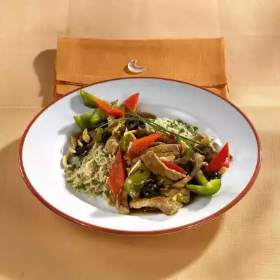 Drain the rice, fold the chives into the rice. Add meat to the vegetables. Stir starch with some water until smooth, thicken sauce with it. Season to taste with honey, salt and pepper. Serve the shredded meat with rice, sprinkle with almond slivers and garnish with chives.