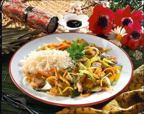 Season with salt and pepper. Add carrot, leek and mushrooms and sauté briefly. Mix stock, soy sauce, starch and curry, add and bring to the boil. Season to taste again. Arrange with rice and serve garnished with parsley