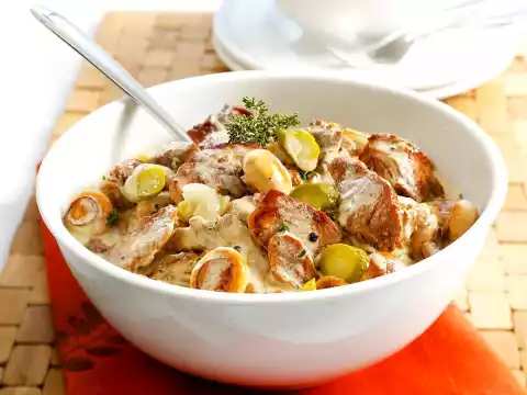 Sauté the meat in portions and season with salt and pepper. Remove meat from the pan and heat 2 tablespoons of oil in the pan. Fry the mushrooms for 2-3 minutes. Fry the onions for the last minute.