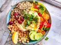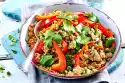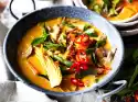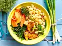 For the salad, clean and wash spring onions and cut into fine rings. Clean, wash and spin dry the radicchio and cut into fine strips. Peel the mango. Cut the flesh first in thin slices from the stone, then into fine strips. Clean and wash the celery and put celery green aside. Cut the celery into fine slices.
