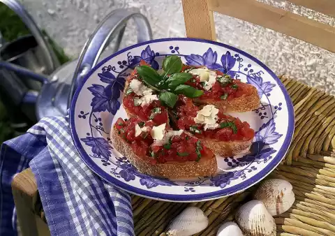 Clean the tomatoes, carve them crosswise, stir briefly in boiling water, rinse with cold water and peel the skin. Seed the tomatoes and cut them into cubes. Wash the basil. Pluck off leaves (put something aside for garnishing) and cut into strips. Mix tomato cubes and basil strips. Peel garlic, chop finely and mix with butter.