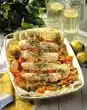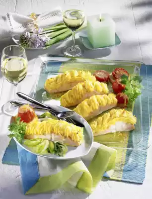 Spray the mashed potatoes spirally onto the salmon slices and bake in the preheated oven (electric cooker: 200 °C/ gas: level 3) for 20-25 minutes. In the meantime whisk the egg yolk and cream. Clean and wash the tomatoes and carve them crosswise as you like, cut them in half or cut off the lid.