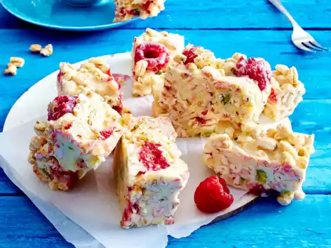 Sort the raspberries, wash and drain if necessary. Coarsely chop the pistachios. Add wheat pops and berries to the chocolate mixture. Pour into the mould. Cover with foil and chill for about 6 hours, preferably overnight.