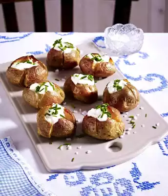 Wash the potatoes thoroughly, spread on an oiled baking tray and bake in a preheated oven (electric cooker: 200 °C/ circulating air: 175 °C/ gas: see manufacturer) for approx. 45 minutes