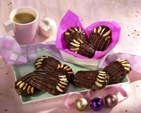 Cream fat and sugar with the whisk of the hand mixer. Add the eggs one after the other. Mix flour, ground almonds, cocoa, baking powder and orange zest and stir into the dough by the spoonful. Grease the madeleine tray (12 troughs) and sprinkle with flour. Fill half of the dough up to the rim into the wells and place on a baking tray. Bake in the preheated oven (electric cooker: 175 °C/ convection oven: 150 °C/ gas: level 2) for approx. 18 minutes.