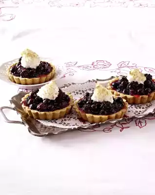 Roll out the dough thinly on a floured work surface. Cut out 4 circles (each approx. 12 cm Ø), knead the dough and roll out. Grease 4 tartlet moulds with lift-off base (each approx. 10 cm Ø), dust with flour and line with dough circles. Add the berry filling and bake in a preheated oven (electric cooker: 175 °C/ convection oven: 150 °C/ gas: see manufacturer) for approx. 20 minutes.