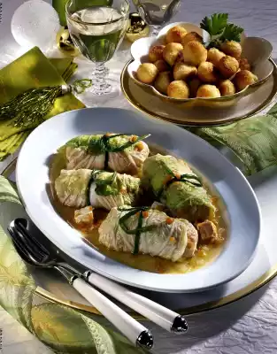 Bake the potato balls on a baking tray in a preheated oven (electric cooker: 200 °C/ convection oven: 175 °C/ gas: level 3) for 15-20 minutes. Dice the tofu finely. Remove the coriander leaves, chop finely and fold into the lentils with the tofu and curry. Pour the lentil mixture onto the cabbage leaves and roll up firmly. Wrap each with a leek straw.