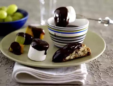 Score the flesh of the fruit crosswise on the skin, pressing the skin inwards. Cut the flesh cubes from the skin. Arrange chocolate sauce in bowls, fruit, marshmallows and biscuits on plates or in bowls.