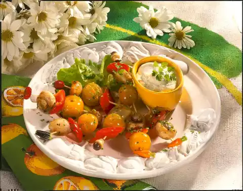 Deglaze with 250 ml water, sprinkle in spice mix and cook covered for another 4 minutes. Add the tomatoes one minute before the end of the cooking time. Meanwhile peel garlic and chop very finely. Mix quark, lettuce cream and mineral water. Stir in garlic and season to taste. Wash the chives, dab dry and cut into fine rolls. Drain vegetables well and let them cool down a little. Put 3-4 vegetable pieces on a small wooden skewer. Sprinkle with chives on a plate and arrange on a salad leaf as desired.