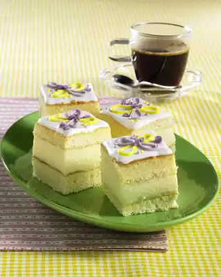 Stir the pudding smooth with the whisk of the hand mixer. Whip cream and vanilla sugar until stiff. Squeeze out the gelatine, dissolve and mix with 4 tablespoons of pudding, then stir into the remaining pudding. Fold in the cream and spread evenly on the base. Cover with the other half of the sponge cake and refrigerate for about 2 hours. Sieve the icing sugar into a bowl. Mix icing sugar and egg white. Add lemon juice by the spoonful and mix to a smooth glaze. Remove 1 tablespoon of icing and colour yellow with food colouring. Take off 1 more tablespoon and colour lilac with red and blue food colouring. Pour the coloured icing into a small freezer bag and cut off a small corner. Cut sponge cake into cubes of approx. 4 x 4 cm. Cover the surface of each cube with white icing. Spray patterns on the cuts with the yellow and lilac icing and decorate with candied lilac flowers