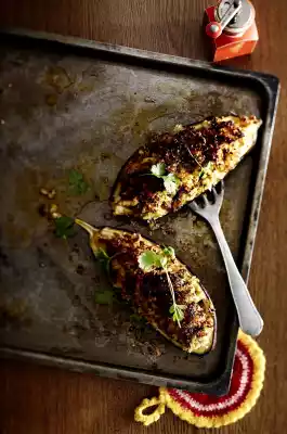 Stir-fry for approx. 5 minutes. Season with approx. 1⁄2 TL curry, salt and pepper. Spread into the aubergine halves, add the coconut gremolata and place on the baking tray. Cook in the hot oven for about 50 minutes, covering with aluminium foil after 40 minutes if necessary.