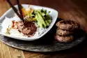 Dab schnitzel dry, cut into 3-4 pieces. Season with salt and pepper. Prepare schnitzel, bread it and fry it. Arrange everything. Serve with flatbread.