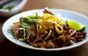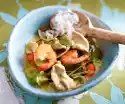 For the dip, mix 2 tablespoons of harissa and crème fraîche. For the breading, chop half the nuts coarsely, grind the rest finely in the universal chopper. Mix all nuts and breadcrumbs. For the egg milk, whisk eggs, 1 tbsp. harissa and milk.
