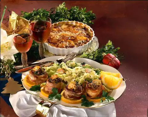 Sprinkle with cheese and pour 200 g cream over it. Bake in the preheated oven (electric cooker: 200 °C/ gas: level 3) for approx. 45 minutes. In the meantime, wash the fillets and pat them dry. Place the bacon slices next to each other.