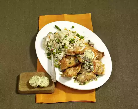 Add onion and garlic cubes and fry for five minutes more. Melt a tablespoon of butter in a frying pan and sauté the asparagus for five minutes. Add peas and steam for two minutes. Drain rice, add and season with salt and pepper. Arrange meat and vegetable rice on a preheated plate. Serve with remaining herb butter