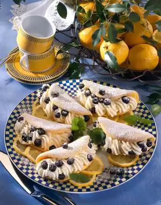 Pour into a piping bag with a star-shaped spout and squirt the cream into the cooled omelettes. Press blueberries into the cream. Dust the omelettes with icing sugar and arrange them on a plate decorated with lemon slices and lemon balm.