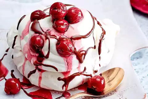 For the meringue, beat the egg whites and 1 pinch of salt until stiff, adding 150 g of sugar. Pour the mixture in 4 large blobs onto a baking tray lined with baking paper. Use a sauce ladle to press a hollow into the meringue before drying so that the cream and cherries can be arranged on the pavlovas. Dry in a preheated oven (electric cooker: 100 °C/circulating air: 75 °C/gas: see manufacturer) for approx. 1 1⁄2 hours. Leave to cool with the oven door slightly open.