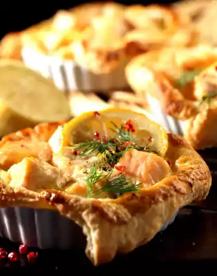 Let the puff pastry thaw slightly, then cut in half. Meanwhile wash the salmon and cut into cubes. Sprinkle with lemon juice and salt. Stir cream cheese, eggs and cream until smooth. Season with salt and pepper. Grease fireproof moulds (approx. 10 cm Ø).