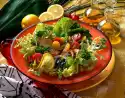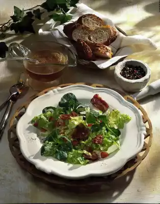 Deglaze frying fat with vinegar and 50 ml water. Season to taste with salt, pepper and sugar. Whip the oil into it. Mix salad and tomato and arrange on four plates. Drizzle vinaigrette over it and sprinkle with pepper.